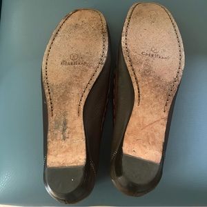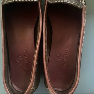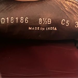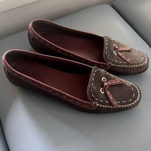 Great color combination! Brown pebbled leather with rose colored leather tassels and trim, off-white stitching. Leather soles as well. Slight heel, round toe. Very comfortable. Size 8.5B. Excellent condition, only worn a couple times.