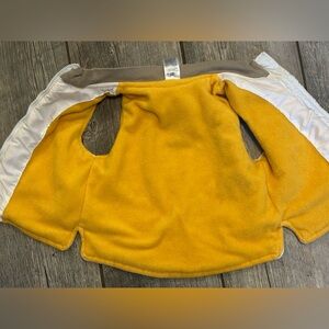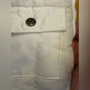 Fleece lined and zips up. Tiny spot on pocket but not very noticeable. See pic.