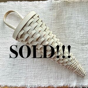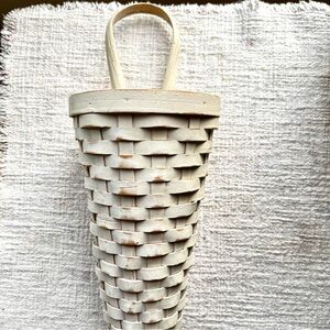 Selling this lovely vintage cone shaped wall basket. I love the cone shape, the attached wall piece and the chipped paint just adds to the overall look! This is just adorable and could be used for drying herbs, hanging on a front door, displaying flowers, small wooden utensils, or for faux carrots, or as a house warming gift! Has a little smooshing at the bottom, no surprises ๐.