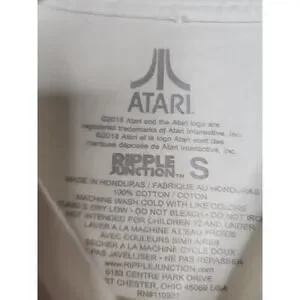 This vintage-inspired white long sleeve tee by Ripple Junction pays homage to the iconic Atari game of 1972. Crafted with care, this pre-owned t-shirt is perfect for any Atari enthusiast looking to add a unique addition to their wardrobe. The long sleeve design adds versatility, making it suitable for wear in any season. The shirt features the classic Atari logo on the front