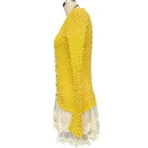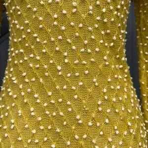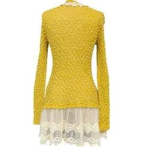 This stunning A’reve mustard yellow cardigan tunic features a delicate lace knit design with textured polka dots, floral lace trim, and a sheer lace hem for a romantic touch. Button-front closure and long sleeves make it a versatile layering piece for any season.
