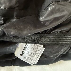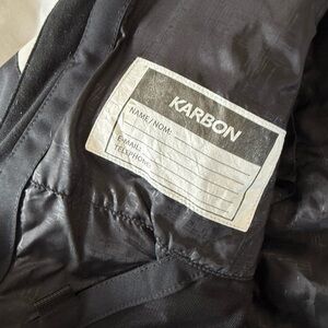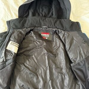 Stylish Karbon ski jacket with a hood and powder skirt. Lightly insulated. Features black and blue colors. Worn by my son three times only! Like new.