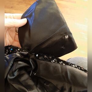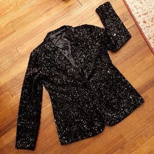 NWOT, Shimmer in style with this elegant black sequin jacket. Perfect for evening events and special occasions, slit front pockets, back kick pleat (still stitched closed), fully lined, snap in shoulder pads, velvet front button closure, approximately 19" pit to pit, approximately 26" shoulder to hem, so chic!!