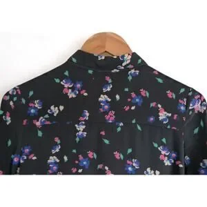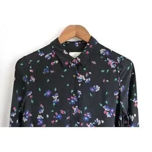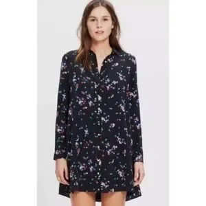 SEZANE Silk Black Pink Floral Print Long Sleeve Mini Shift Shirt Dress S $205