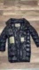 Crafted from nylon with a subtle sheen, the mid-thigh length coat features a high, funnel collar with silver-tone logo studs and a snap button closure.