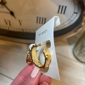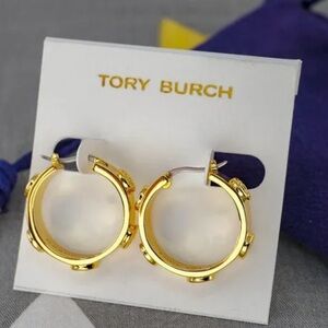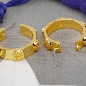 Elegant gold hoop earrings with Tory Burch logo. Perfect for any occasion.