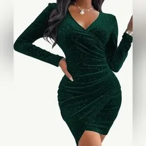 Keywords: bodycon dress, green velvet, party dress, cocktail dress, elegant, glamour, ruched, wrap style, V-neck, long sleeve, fall fashion, stretchy, surplice hem, pullover closure.