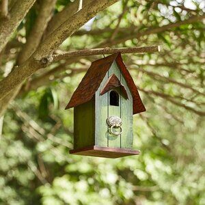 PREMIUM CRAFT: This birdhouse is styled with a distressed look, using rusted metal and worn paint.