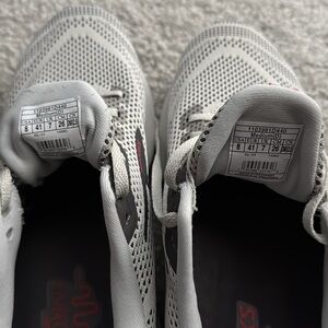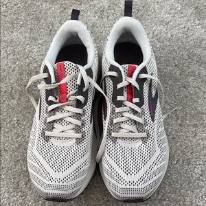 Stylish white and black athletic sneakers with red accents. Perfect for running or casual wear.