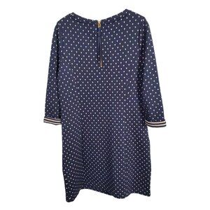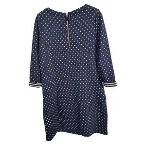 Keywords: Preppy, Nautical, Quilt, Boden dress, polka dot dress, navy dress, 3/4 sleeve dress, zip back dress, casual dress, striped cuff dress, UK16 dress, US12 dress, cotton blend dress, pockets, quilted dress, navy polka dots