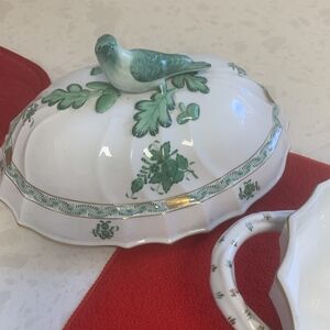 Elegant white Herend serving tureen/bowl with green hand painted delicate design.