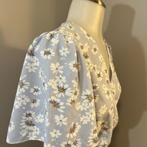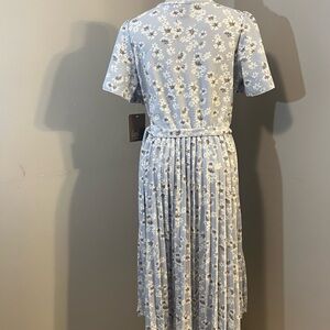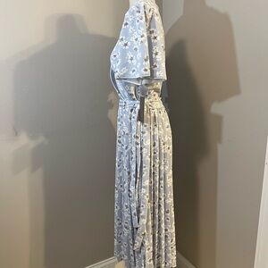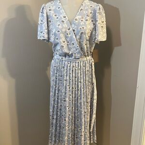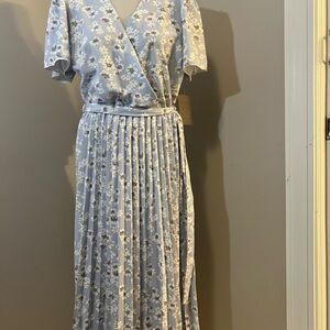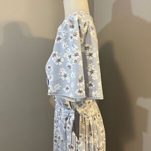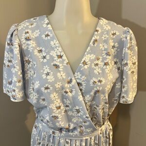 This charming sundress features a soft blue hue with a flattering wrap-style bodice and a v-neckline. The flutter sleeves and pleated midi skirt add a touch of elegance, making it perfect for both casual outings and work settings. A tie front at the waist enhances the silhouette, offering a stylish and comfortable fit.