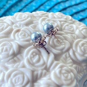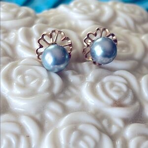 These elegant, genuine salt water pearl earrings feature a stunning silvery blue tone, perfect for any occasion. The intricate design adds a touch of sophistication to your look. Missing one back and will substitute. Formal or casual. Posts & Jackets are 14K solid yellow gold.