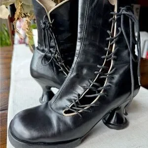 Elevate your style with these chic black lace-up boots from fluevog mini sugars . Sold out style, collector fashion . Black and cream - great condition except for a very small scuff in the heal (please see in close-up photographs and the video) toes and everything else are great .