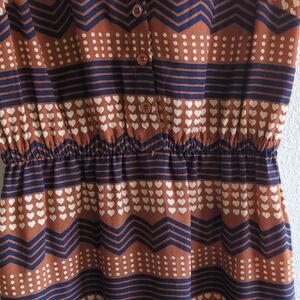 Stylish sleeveless dress featuring a unique pattern in brown, navy blue, and ivory white. Perfect short length for casual outings this Spring and Summer. Has a classic collar for a flattering v neck into a button down front. The waist has an elastic band for a feminine fit, plus there are small loops if you want to add a belt! Cinch waist minidress. The pattern has zig zag, stripes, polka dots and hearts. so cute! It is in good used condition. Polyester machine washable. BeBop brand size M.