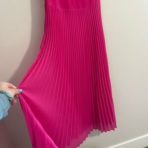 This chic pink midi dress features a flowy skirt that moves gracefully with every step. Its sleeveless design offers a modern and versatile look, perfect for both casual outings and special occasions. The dress's vibrant color adds a touch of elegance to your wardrobe.