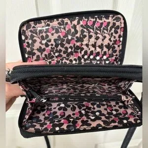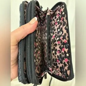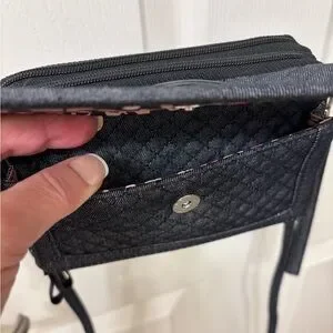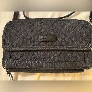 Vera Bradley denim double zip wallet has removable crossbody and wristlet straps for tons of versatility. Photos may appear black, but it is a very dark denim blue. Crossbody strap is adjustable.