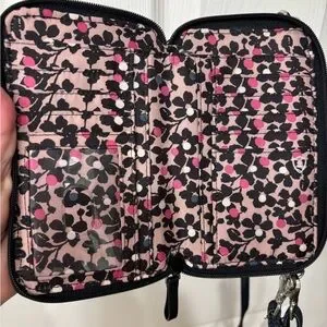 Floral interior features zipper coin compartment, ID window, 8 card slots, and 6 currency/document slots. Silver tone hardware. About 7x4.5x2”.