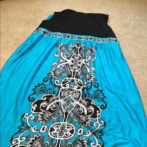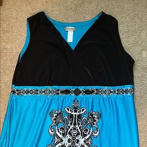 This stunning maxi sundress by Catherines features a sleeveless design with a v-neckline, perfect for casual outings. The dress showcases a beautiful blend of blue and black, adorned with sequin embellishments that add a touch of sparkle. Its flowing silhouette and intricate detailing make it a standout piece for any casual occasion.