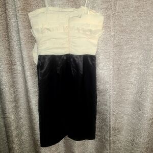 This elegant sheath dress features a striking cream ruched bodice and a sleek black skirt, perfect for a night out. The strapless design adds a touch of sophistication, making it an ideal choice for cocktail events.