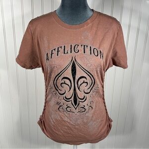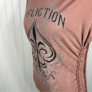 This Affliction t-shirt in a vibrant pink hue features a striking graphic design on the front, highlighted by the brand's bold logo. The short sleeves and ruched detailing add a touch of style, making it a standout piece in any wardrobe. Chest 17in length 25.5