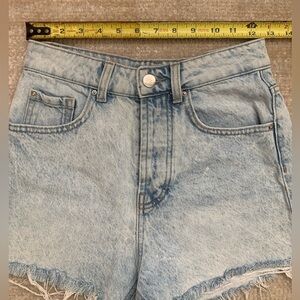 High-waisted shorts, light wash. Five pockets and washed effect. Frayed hem. Front zip and metal button closure.