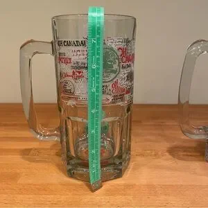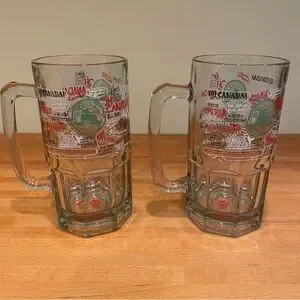 Celebrate with this set of glass beer mugs. Perfect for enjoying your favorite beverages in style. Approximate size: height - 8”, diameter - 4”.