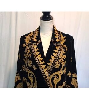 This is a Free People blazer in size Small with a black velvet outer shell featuring a paisley embroidered design. It has long sleeves, a button closure, and a cotton lining. The blazer has a short length and a regular fit, suitable for casual or business occasions. Its style is a basic jacket with a bohemian and artistic theme, perfect for the fall and winter seasons.
