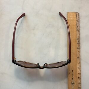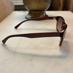 These beautiful Lacoste sunglasses are great for everyday use. They are a classic rectangular shape and the colors style great with everything. The tortoise shell pattern has tan and burgundy for an added style touch. The sides have a minimalist look and come complete with a simple crocodile. Elevate your look with these chic red gradient sunglasses. Perfect for any occasion, these accessories add a touch of elegance to your style. These sunglasses are in excellent condition.
