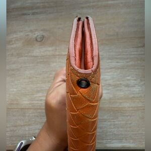 Stylish orange woven leather wallet. Perfect for any occasion.
