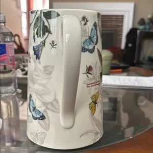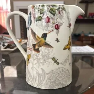Beautiful ceramic pitcher featuring a floral and hummingbird design. Perfect for serving beverages or as a decorative piece.