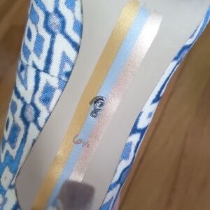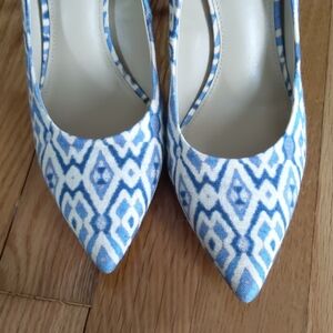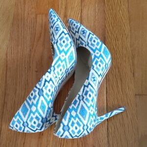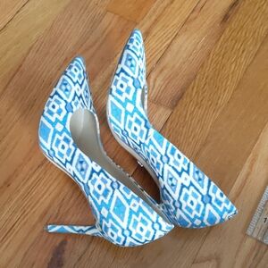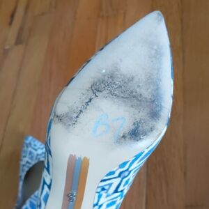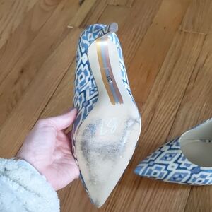 Step out in style with these chic blue patterned Sam Edelman heels. Perfect for any occasion. Size 6.5. Like new with some light scuffing on the bottom front shown in the photo. Heel measurement in photo.