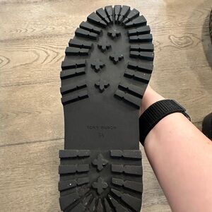 Tory Burch black leather Chelsea boots with lug soles. Originally purchased for $490 - worn twice. Beautiful Italian leather. One small pull on the bottom of one boot (shown in photos).