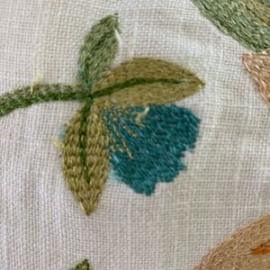 Beautiful throw pillow with embroidered floral design with 3D organza ribbon accents. Features red, orange, and tan flowers with green leaves on a cream background.