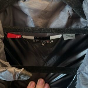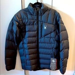 Stylish black puffer jacket by Spyder. Features a sleek design with a front zipper.