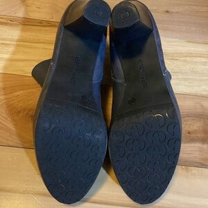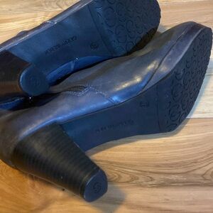 Step out in style with these sleek black ankle boots. Perfect for any occasion. In good preloved condition with blueish grey patina leather. There is fading and markings see pictures. The wear adds to the look. Heels show some scuffing. Soles are in good condition.