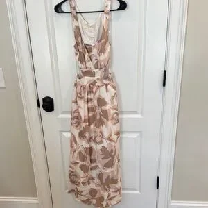 Elegant women's dress featuring a beautiful floral pattern in tan and cream. Perfect for any occasion.