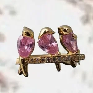 Three dainty Pink Cubic Zirconia Spring Birds Perched on a Golden Tree Branch lined with clear rhinestones. Ring Size 7. New Fashion Jewelry Tibetan Silver
