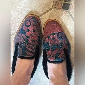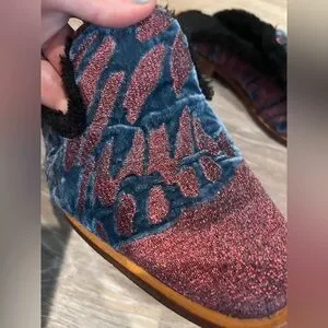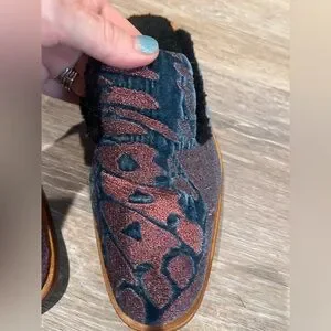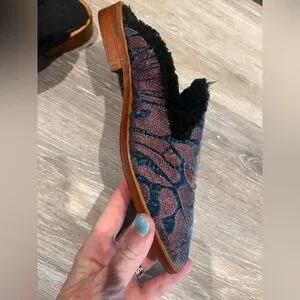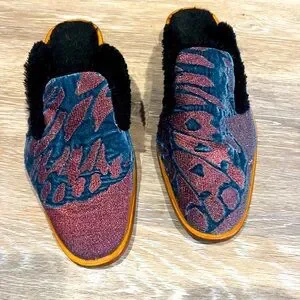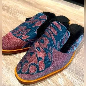 Free People Butterfly Effect Slip on Mules/Slippers. Navy blues, shimmer pinks & burgundy tapestry print of velvet & brocade. The material really catches light beautifully. These are easy to slip on & add fun to elevate your look. Pair them year round for versatile looks!