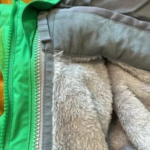 3-in-1 coat zips apart for a green outer jacket and grey fuzzy fleece