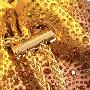 Sparkly handbag, crystal studded bag, yellow and pink ombre purse, rhinestone evening bag, drawstring bag, gold chain bag, statement bag, luxury handbag, designer-inspired purse, glamorous evening clutch, beaded handle bag, prom accessory, wedding guest bag, party handbag, cocktail bag, gradient color bag, gold-plated hardware, dazzling purse, fashion-forward bag, statement accessory, special occasion bag, trendy handbag, sparkling purse, chic bag, bling purse, unique style handbag, eye-catching
