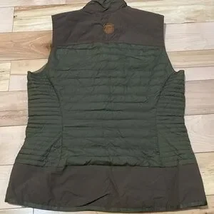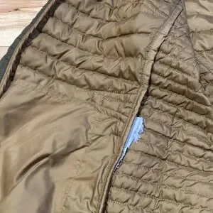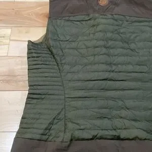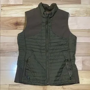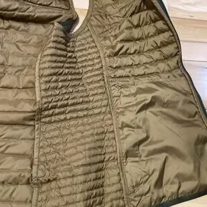 Stay warm and stylish with this down filled olive quilted vest. Perfect for layering, it offers comfort and versatility for any occasion. In great preloved condition with very minimal pilling. Super chic detail with brown shoulder and waist details. Love the zipper closures on the exterior pockets and the interior has two roomy pockets.