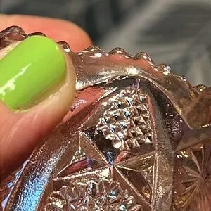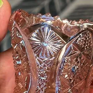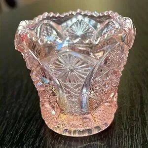 Elegant pink glass toothpick holder with intricate patterns. Perfect for adding a touch of elegance to any room. 2.5” tall approximately. One small flea bite as shown and some lines from the mold.