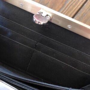 This cute wallet has a center zipper, two clear slots six card slots and four sections total it is 100% polyester cover and nylon inside. Closure slips through and snaps closed. Good condition with minimal wear. Please see photos for details.
