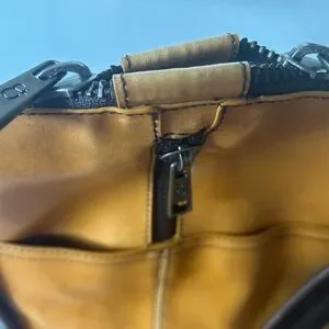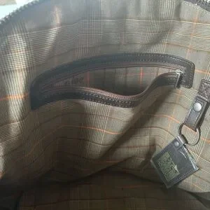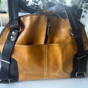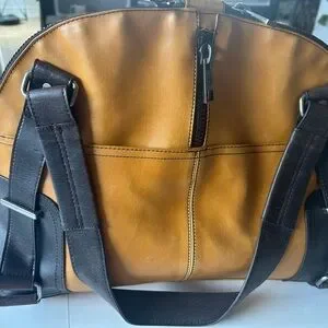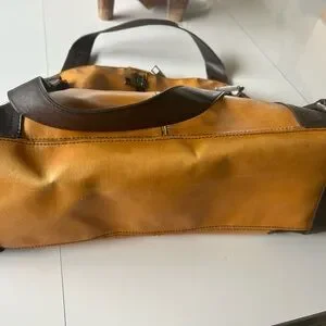 Stylish and durable brown/tan heavy leather. 18” x 12” x5” Rare. Crease near bottom of bag.