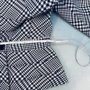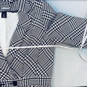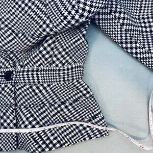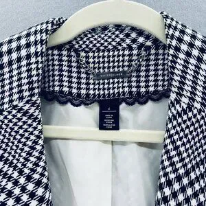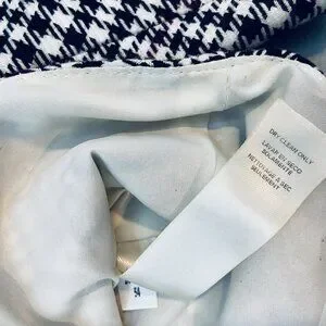 This WHBM Black White Houndstooth Fitted Peplum Blazer in size 6 is a classic and feminine piece suitable for casual, workwear, or business occasions. The blazer features a houndstooth pattern in black, white, and red, with a short length and long sleeves.