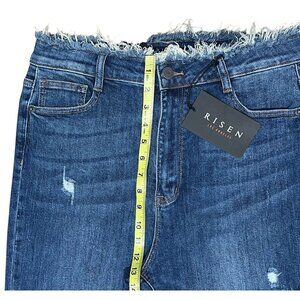 Risen Women Jeans RAW EDGE WAIST W FRAYED HEM FLARE Blue Distressed 32/15 NWT