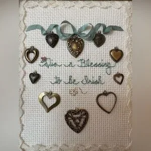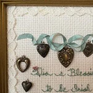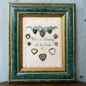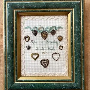 Beautiful framed Irish Blessing piece in green marbled frame with gold trim. The saying is done in counted cross-stitch on fine linen and says: “It’s a blessing to be Irish.” The saying is surrounded by 10 little gold hearts and a tiny green satin ribbon. Even the back of the piece is pretty - it is ecru paper with pink roses. It measures 7-1/4” x 6-1/4.” Perfect gift for a friend, a family member, yourself, or anyone else you know who is blessed to be Irish. ☘️ ☘️ ☘️