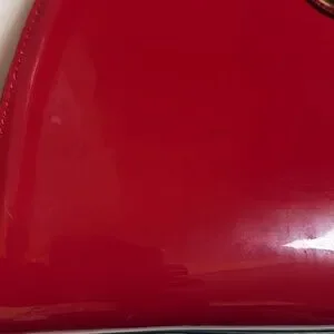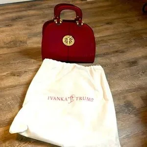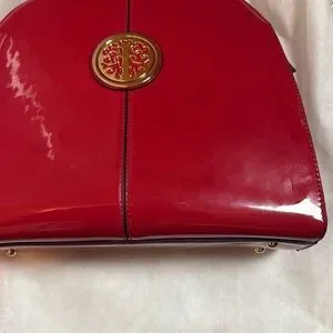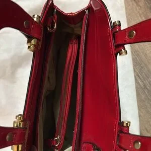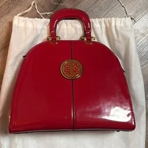 EUC Ivanka Trump Red Patent leather bold gold emblem and gold hardware accent hand bag with bag 4 semi imperfections on the bag, strap is missing