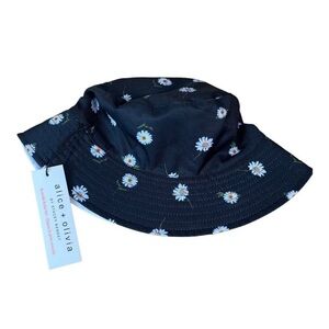 Chic and stylish, this Alice + Olivia bucket hat features a charming daisy pattern on a black background. Perfect for adding a touch of elegance to any outfit. Reversible from daisy print to all white!